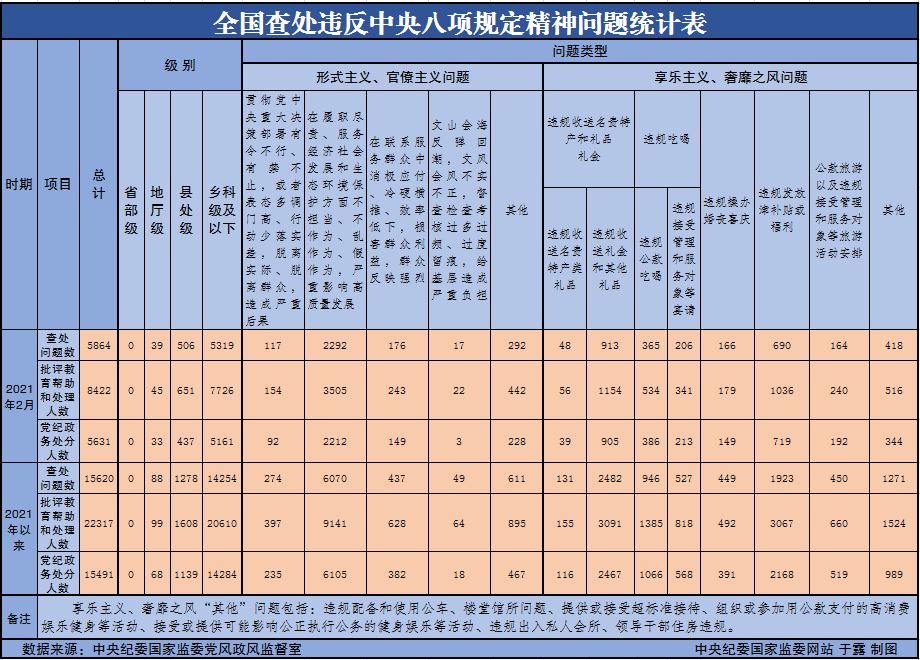 3月29日,中央紀(jì)委國(guó)家監(jiān)委公布了2021年2月全國(guó)查處違反中央八項(xiàng)規(guī)定精神問題匯總情況。當(dāng)月,全國(guó)各級(jí)紀(jì)檢監(jiān)察機(jī)關(guān)共查處違反中央八項(xiàng)規(guī)定精神問題5864起,批評(píng)教育幫助和處理8422人,其中黨紀(jì)政務(wù)處分5631人。