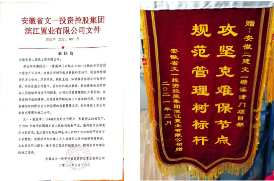 2021年3月31日,獲安徽省文一投資控股集團(tuán)濱江置業(yè)有限公司表?yè)P(yáng),并授予錦旗。