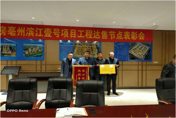 北京城房亳州公司真摯邀請(qǐng)四分公司及項(xiàng)目機(jī)關(guān)人員參加濱江壹號(hào)項(xiàng)目預(yù)售表彰會(huì),北京城房對(duì)二建公司的努力與付出表示肯定與認(rèn)可,并頒發(fā)錦旗與表?yè)P(yáng)信。