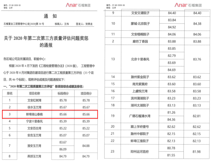 本次檢測(cè)涉及33個(gè)項(xiàng)目、46個(gè)標(biāo)段、39家施工單位,檢測(cè)方采用隨機(jī)抽取的辦法,按照統(tǒng)一標(biāo)準(zhǔn)、統(tǒng)一尺度進(jìn)行檢測(cè),檢測(cè)數(shù)據(jù)實(shí)時(shí)上傳,確保檢測(cè)結(jié)果公平公正,評(píng)估分為工程質(zhì)量實(shí)測(cè)實(shí)量、混凝土檢測(cè)、安全文明施工、質(zhì)量風(fēng)險(xiǎn)防控四個(gè)部分,檢測(cè)結(jié)果如實(shí)反映各工程的實(shí)際施工質(zhì)量水平。安徽二建公司承建的蚌埠湖山春曉項(xiàng)目在檢測(cè)中綜合得分85.66分,位列第三名,受到建設(shè)單位的通報(bào)表揚(yáng)和獎(jiǎng)勵(lì),為公司贏得了社會(huì)信譽(yù),同時(shí)也為和石榴集團(tuán)下一步合作奠定了堅(jiān)實(shí)基礎(chǔ)。