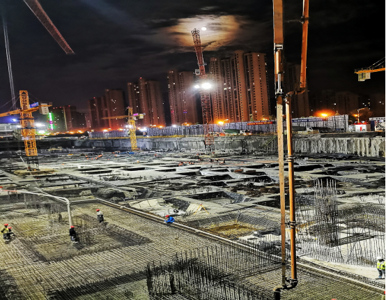 施工進(jìn)入白熱化階段,遇到材料短缺、勞務(wù)班組緊張等困難,分公司領(lǐng)導(dǎo)更高度重視,組建了由各個(gè)科室負(fù)責(zé)人參加的“重點(diǎn)項(xiàng)目工作協(xié)調(diào)QQ群”,把項(xiàng)目遇到的難題及時(shí)反饋并予以解決,分公司經(jīng)理馬福才、支部書記陳習(xí)武更是經(jīng)常駐扎現(xiàn)場,解決勞務(wù)外援、協(xié)調(diào)處理大宗主材進(jìn)場等問題。在每日召開的生產(chǎn)調(diào)度會上,項(xiàng)目經(jīng)理汪傳松多次強(qiáng)調(diào),要超前謀劃,科學(xué)組織,大膽管理,各勞務(wù)班組根據(jù)現(xiàn)有工作面盡快增加班組和一線作業(yè)工人,上足人員;項(xiàng)目部要合理配置人力、物力、塔吊等垂直運(yùn)輸設(shè)備,安排好工序銜接,實(shí)現(xiàn)晝夜不間斷施工,同時(shí)要確保“大干大安全、小干有安全”,針對業(yè)主6月20日提出正負(fù)零節(jié)點(diǎn)計(jì)劃,項(xiàng)目部制定了四點(diǎn)措施:一是分解目標(biāo),細(xì)化責(zé)任,日排計(jì)劃,要求現(xiàn)場施工人員根據(jù)圖紙認(rèn)真梳理計(jì)算各標(biāo)段工程量,詳細(xì)分解施工任務(wù);二是明確現(xiàn)場責(zé)任分工,加大管理力度,督促現(xiàn)場盯控力度,保障工程質(zhì)量;三是加大協(xié)調(diào)力度,優(yōu)化資源,整合機(jī)械設(shè)備發(fā)揮最大的生產(chǎn)力;四是加強(qiáng)與勞務(wù)班組負(fù)責(zé)人的溝通,明確節(jié)點(diǎn)任務(wù),輸貫信念,激發(fā)工人潛力,提高工作效率。全體人員要同心協(xié)力,充分發(fā)揮團(tuán)結(jié)奮進(jìn)精神,要見縫插針,穿插作業(yè),要有“搶晴天戰(zhàn)雨天,白天晚上加班干”的精神,強(qiáng)勢推進(jìn)施工進(jìn)度。從5月12日到5月25日已完成產(chǎn)值2300萬,創(chuàng)安徽二建公司月產(chǎn)值歷史新高;截至目前,鋼筋用量1700噸;混凝土用量11000方,平均每日混凝土澆筑量550方。