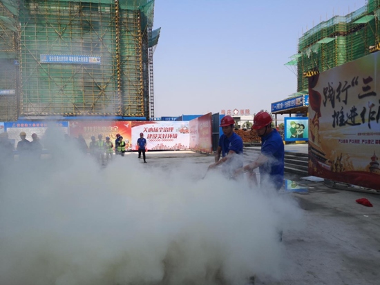 啟動(dòng)儀式上,一分公司副經(jīng)理崔俊對本次安全生產(chǎn)月活動(dòng)主題、活動(dòng)主要內(nèi)容進(jìn)行了宣貫,并對后期安全生產(chǎn)工作進(jìn)行安排部署,隨后在安全負(fù)責(zé)人的帶領(lǐng)下莊嚴(yán)宣誓,并有序地在宣誓標(biāo)語橫幅上簽名。項(xiàng)目人員還觀摩學(xué)習(xí)了滅火器的正確使用方法以及對因高空墜物受傷人員的緊急處理演示。