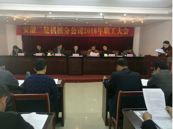 大會聽取并審議通過了《機械分公司工作報告》、《機械分公司財務工作報告》、《分公司2017年度業(yè)務招待費使用情況報告》。分公司工作報告全面總結了2017年生產(chǎn)經(jīng)營管理工作,對2018年經(jīng)營發(fā)展形勢進行研判,明確提出了分公司2018年度工作目標和工作重點。報告指出,2018年是全面貫徹黨的十九大精神的開局之年,是改革開放40周年,是決勝全面建成小康社會、實施“十三五”規(guī)劃承上啟下的關鍵一年,也是我們二建公司全面復興的決勝之年。2017年度機械分公司在公司各級領導的關懷和指導下,堅持安全生產(chǎn),努力完成公司年度經(jīng)濟指標,凝心聚力,克服工作中的各種困難,確保機械設備安拆的安全和質量,在資金緊張,收款困難的前提下,完成了年初公司制定的各項經(jīng)濟指標。