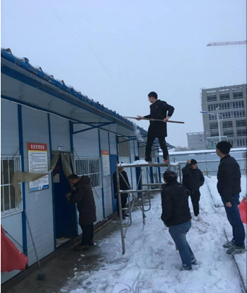 大伙兒冒著寒風(fēng),紛紛拿著鐵鍬、掃帚等打掃工具趕赴掃雪現(xiàn)場,相互配合、齊心協(xié)力,你鏟我掃,一點(diǎn)點(diǎn)地將積雪鏟起集中堆放,一派熱火朝天的景象。經(jīng)過一個多小時的奮戰(zhàn),項(xiàng)目部施工現(xiàn)場主要通道和項(xiàng)目部院子、生活區(qū)等地的積雪全部鏟除,看著清理干凈的路面,大家洋溢著開心的笑容。
