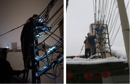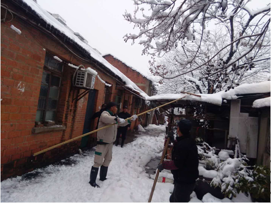 1月4日、5日,合肥地區(qū)普降暴雪,致使公司大院、分公司各生活基地多處老、舊平房100多戶遭受暴雪災(zāi)襲擊,造成樹枝斷裂壓在房頂上,危及職工住戶生命安全。路口路段出現(xiàn)大面積積雪堆積,交通堵塞,影響居民正常生活出行。面對(duì)緊急災(zāi)情,后勤綜合服務(wù)部一是立即成立了除雪保暢、維修應(yīng)急處置小分隊(duì),合理分工,各負(fù)其責(zé)。分赴公司大院、二、四分公司生活基地,冒著雨雪搶修高壓電網(wǎng)短路、水管爆裂等災(zāi)情;二是安排人員張?zhí)┭┨鞖庾龊美吓f房屋、人身安全緊急通知的告示,防患于未然,安全為天;三是與安裝分公司協(xié)助,抽調(diào)專業(yè)電工人員幫助消除電網(wǎng)隱患,確保住戶用電安全;四是針對(duì)公司大院31棟北側(cè)一棵高13米,直徑0.7米的大樹被雪壓倒塌,造成一墻之隔的安紡2村住宅樓第二單元部分損壞和居住安全隱患,后勤及時(shí)聯(lián)系專業(yè)樹木砍伐隊(duì)伍,對(duì)樹木進(jìn)行分段切割,消除了倒塌樹木對(duì)住戶造成的安全隱患,確保了住戶的人身和財(cái)產(chǎn)安全。