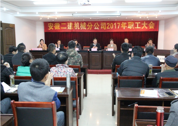 立足新起點,實現(xiàn)新跨越!3月23日上午,安徽二建機(jī)械分公司在原公司三樓會議室隆重召開2017年職工大會。公司黨委書記劉賢奇、紀(jì)委書記仇多維、女工主任王俊及機(jī)械分公司領(lǐng)導(dǎo)班子成員與職工40多人參加了會議。