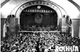 4月23日,在延安楊家?guī)X中央大禮堂,七大開幕式的主席臺上,懸掛著毛澤東和朱德的巨幅畫像,鮮艷的黨旗掛在兩邊。會場后面的墻上,掛著“同心同德”四個大字。兩側(cè)墻上張貼著“堅持真理”“修正錯誤”等標(biāo)語,靠墻邊插著24面紅旗,象征著中國共產(chǎn)黨24年奮斗的歷程。插紅旗的“V”字形木座是革命勝利的標(biāo)志。在主席臺的正上方,懸掛著一條引人注目的橫幅:“在毛澤東的旗幟下勝利前進(jìn)!”