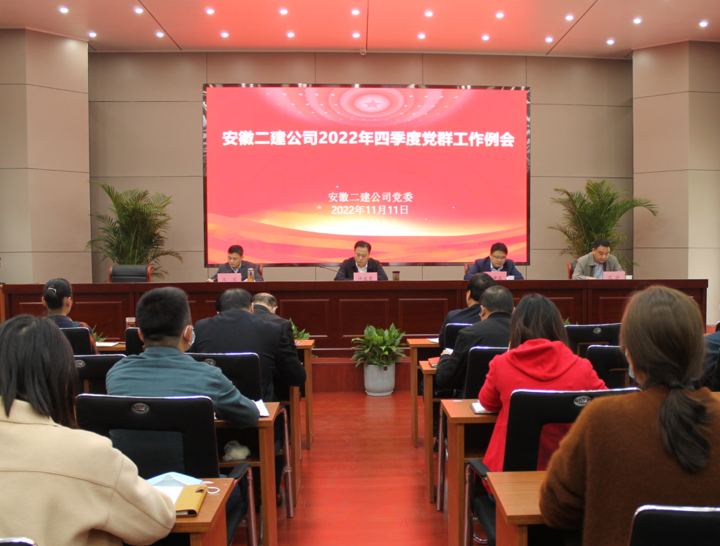11月11日上午,安徽二建公司召開(kāi)2022年四季度黨群工作例會(huì)。黨委書記、董事長(zhǎng)許業(yè)勇出席會(huì)議并講話,公司領(lǐng)導(dǎo)李建成、王軍、沈壯出席會(huì)議,黨群部門人員、所屬各單位黨支部書記、工會(huì)主席、團(tuán)支部書記、綜合辦負(fù)責(zé)黨務(wù)工作人員參會(huì)。會(huì)議由王軍主持。