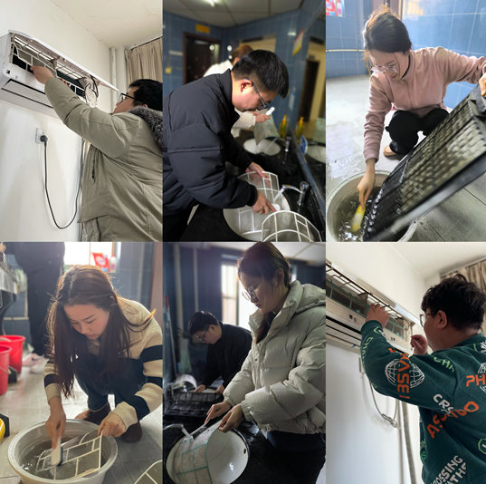 活動期間,大家分工協(xié)作、互相配合。志愿者先對空調(diào)進行斷電,打開空調(diào)蓋板,取出空調(diào)濾網(wǎng),接著使用抹布和清洗劑對空調(diào)外機、濾網(wǎng)等部件進行全面細(xì)致的清洗。