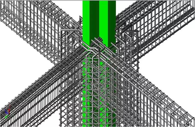 在復(fù)雜節(jié)點的地方,鋼筋的碰撞發(fā)揮著重要的作用。在型鋼混凝土梁柱節(jié)點處,鋼筋數(shù)量眾多,且因為型鋼的存在,造成梁的縱向鋼筋無法直接拉通。BIM工程師搭建節(jié)點模型,對鋼筋的排布進(jìn)行調(diào)整,通過繞彎、預(yù)留洞口、焊接等方式,避免鋼筋與型鋼的碰撞。