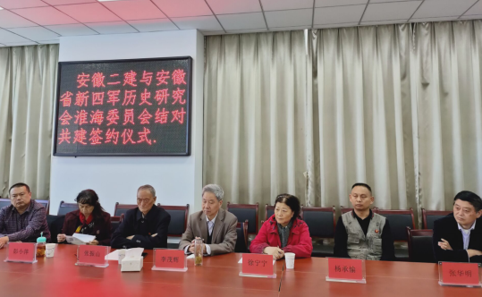 2020年10月26日下午,安徽省新四軍歷史研究會(huì)淮海委員會(huì)會(huì)長(zhǎng)張振山,副會(huì)長(zhǎng)徐寧寧、彭小萍、張華明、楊承愉、李茂輝以及秘書長(zhǎng)高立共7人蒞臨安徽二建四分公司開展結(jié)對(duì)共建簽約儀式。