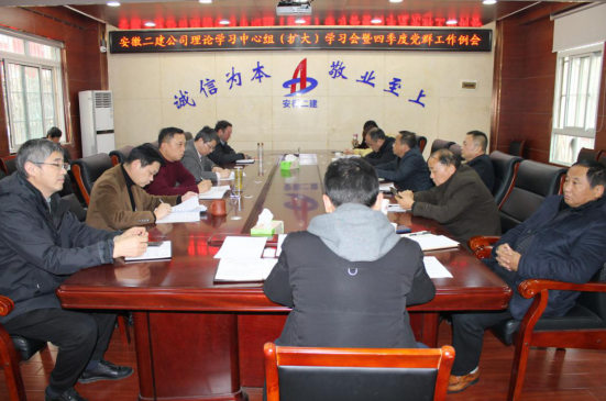 12月11日下午,安徽二建公司召開黨委理論學(xué)習(xí)中心組(擴(kuò)大)暨四季度黨群工作會,公司領(lǐng)導(dǎo)班子、黨委工作部、紀(jì)檢監(jiān)察室、工會、團(tuán)委、信訪保衛(wèi)部、人力資源部主要負(fù)責(zé)人,所屬各黨支部書記參加。會議由黨委副書記、紀(jì)委書記仇多維主持。