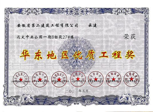 近日,由安徽二建公司承建的“舒城遠(yuǎn)大中央公園工程一期B標(biāo)27#樓”工程被授予了“2021年度‘華東地區(qū)優(yōu)質(zhì)工程獎’”榮譽(yù)稱號。